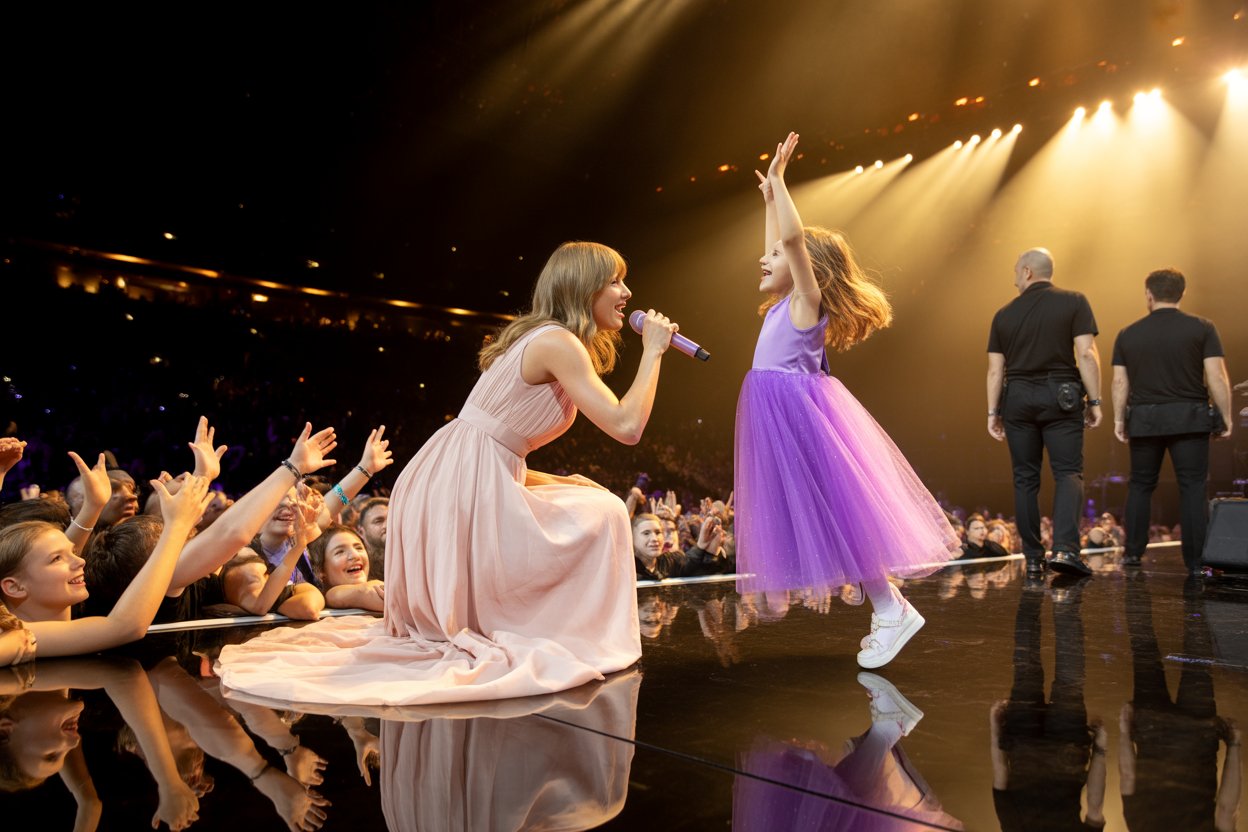 “Lucy has something to say.” The arena fell silent. 80,000 people stopped singing. Stop moving. stop breathing. All focused on the tiny figure in the purple dress standing at the foot of the stage. Lucy looked up at Taylor with wide earnest eyes. Now that she had Taylor’s attention, she seemed suddenly shy, overwhelmed by the magnitude of the moment and the sea of faces watching her.