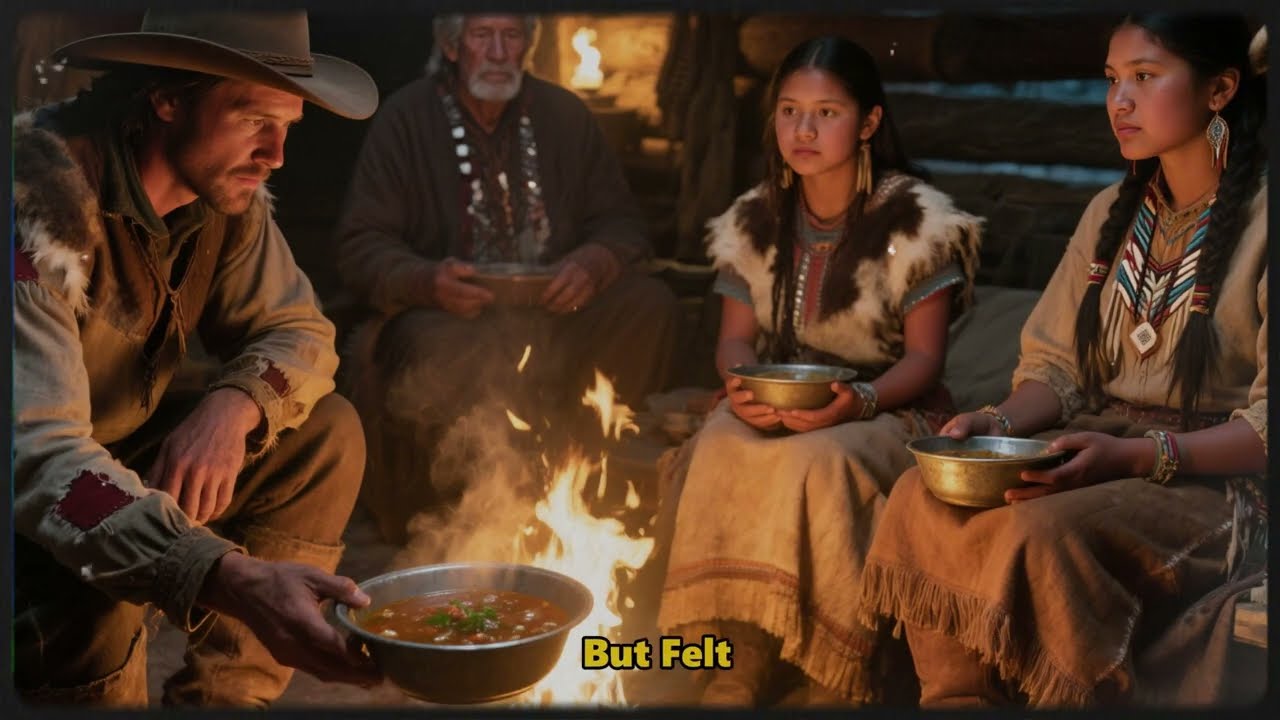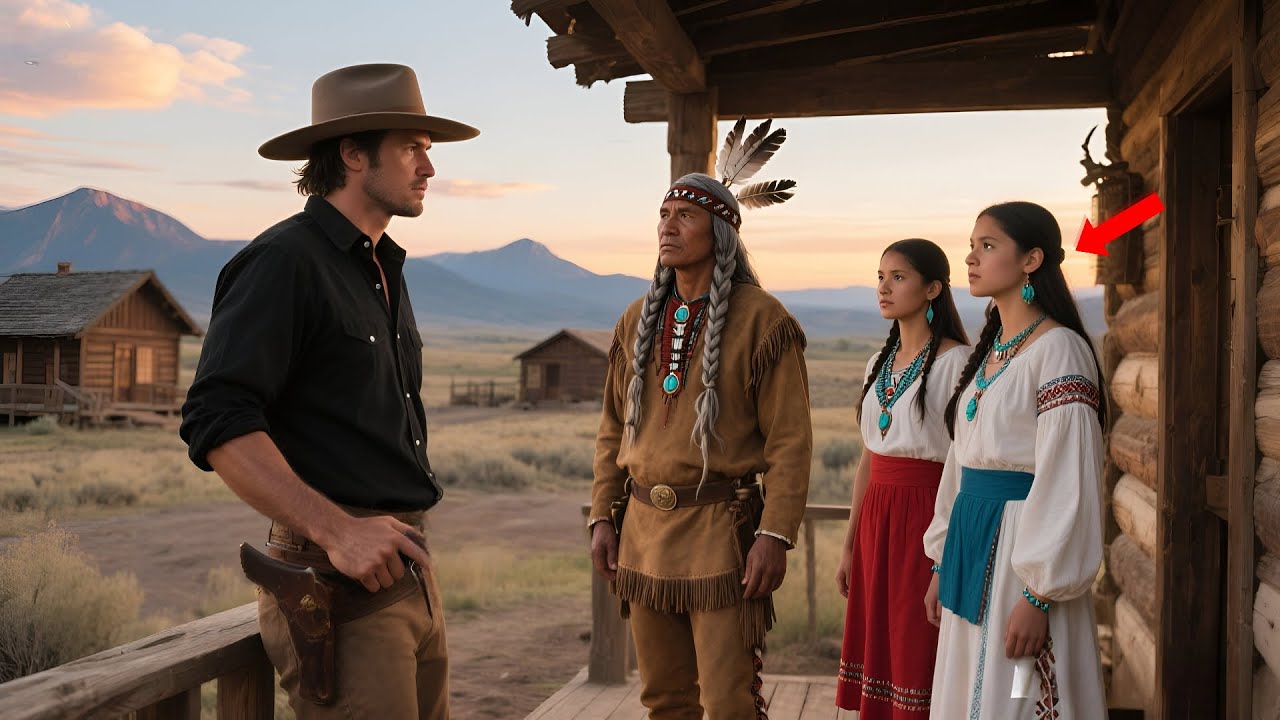 The chief stared at him long, his face unreadable, the crackle of the fire the only sound between them. His daughters watched from the shadows, the younger with wide eyes, the elder with her hands folded tightly in her lap, breath caught. The cowboy’s shoulders remained straight, though his heart beat wild beneath his chest. The chief silence stretched until it felt as though the cabin itself held its breath.