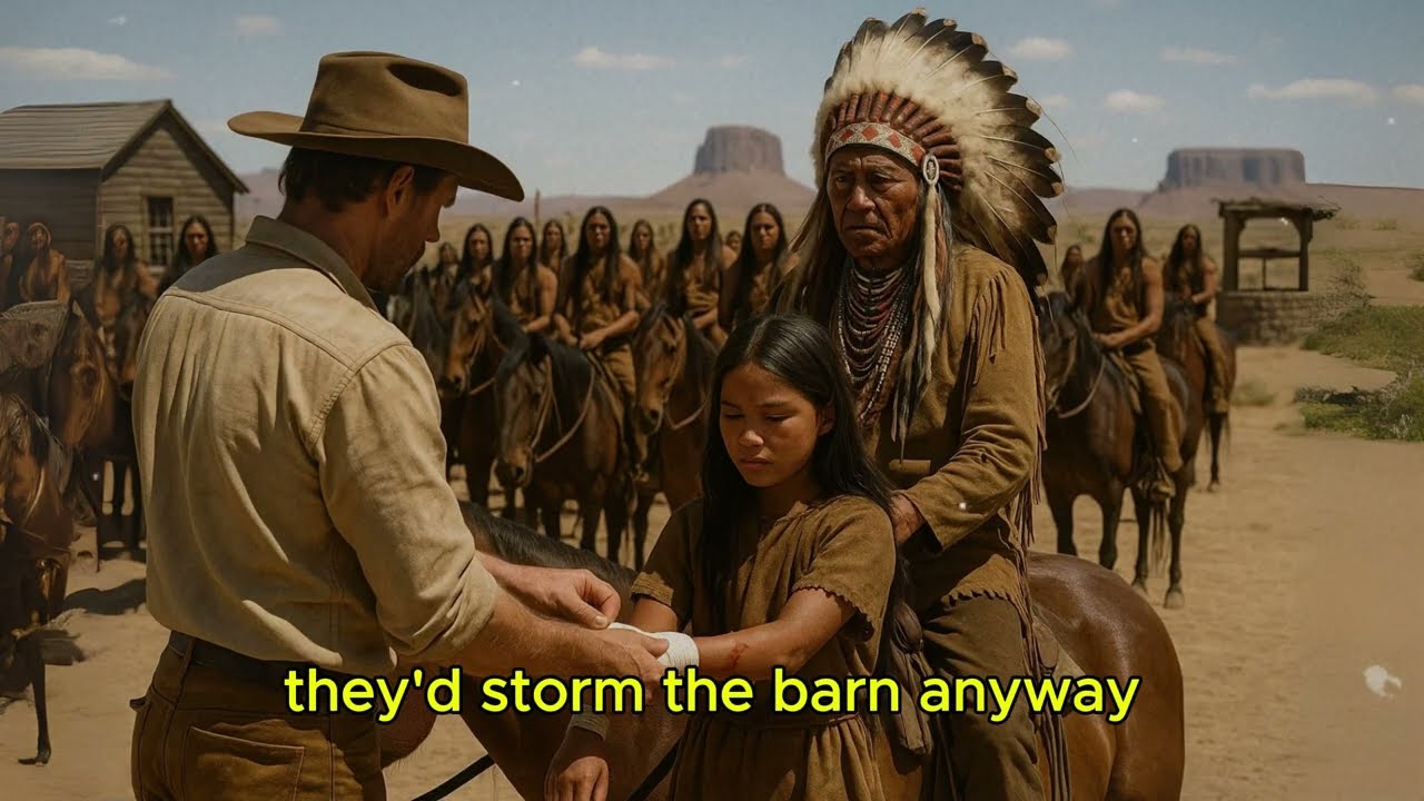 He peered through the barn slats and counted them. 50 mounted warriors painted for war, surrounding his property in a perfect circle. Their leader sat tall on a painted stallion. An older man with gray streaks in his braided hair and scars across his chest that spoke of countless battles. The girl stirred behind him, fever burning through her small frame.
