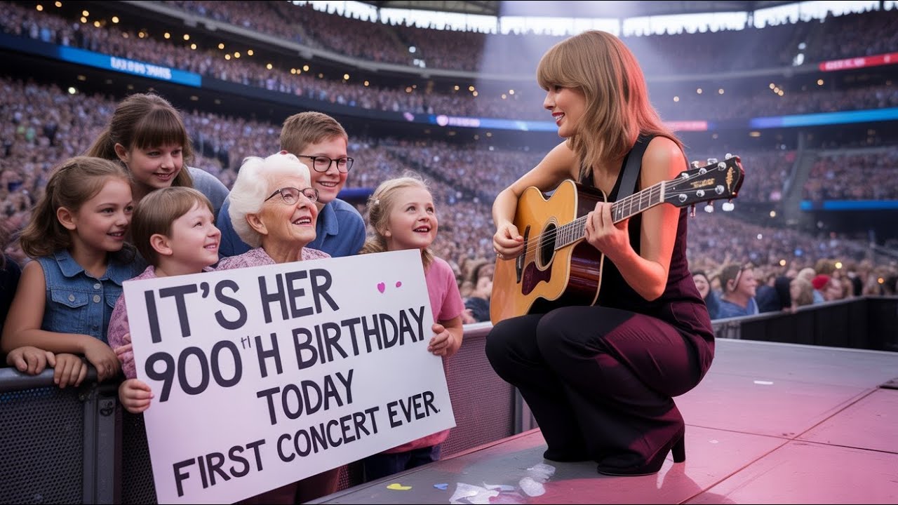 The backing track continued, but Taylor slowed down, walked toward their section, and squinted at the sign. Then she stopped completely. The band realized, and cut the music. 65,000 people went quiet. Wait, Taylor said into the microphone. That sign, it’s her 90th birthday today. First concert ever. Whose 90th birthday? The grandchildren pointed at Dorothy.