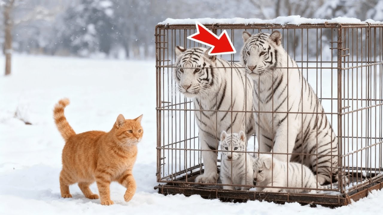 The cat hesitated, instinctively fearful, but the faint cries of the tiger cubs pulled it closer. It stopped, raised its head, and met the tigress’s gaze. For a brief moment, something wordless passed between predator and pry strange fragile understanding. The orange cat turned around and darted away, racing through the snowy trail toward the mountain road below.