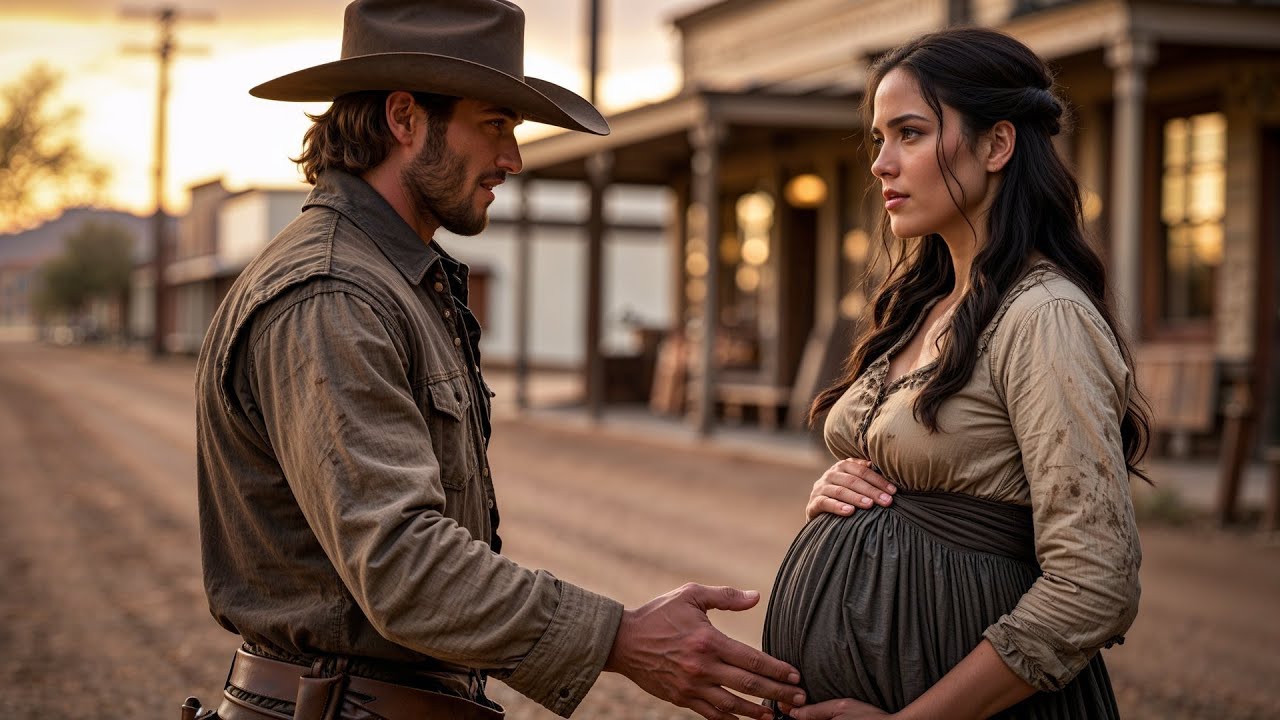 As he approached the general store entrance, a soft whimper caught his attention. In the narrow alley between the store and the barber shop, a woman huddled against the wall, one hand extended, the other protectively curved around her swollen belly. Her dress, once fine but now patched and dirty, hung loosely except where her pregnancy pulled the fabric taut.