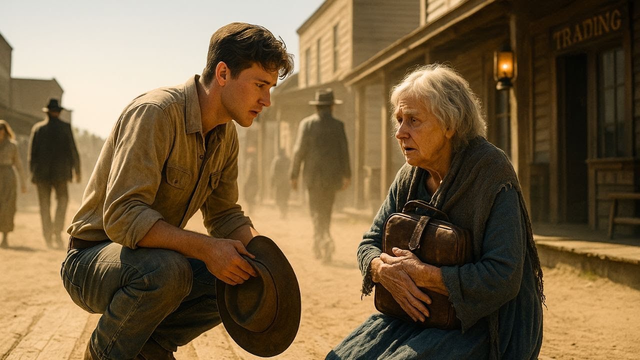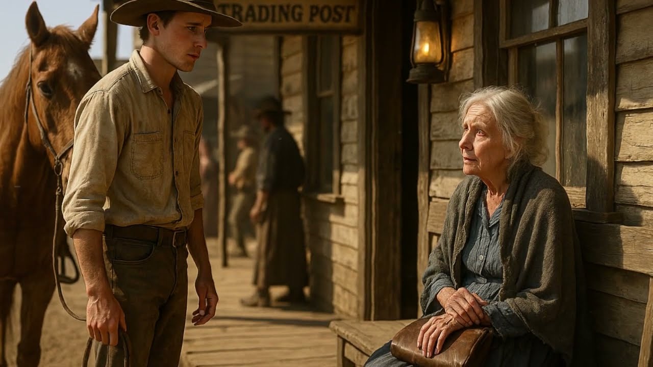 In the dusty frontier town of Copper Ridge, everyone walked past her like she was invisible. An old woman confused and lost at the trading post, clutching a worn leather bag, while folks hurried by without a second glance. But when 19-year-old Jake Thornfield, a broke ranch hand with nothing but the clothes on his back and his father’s old horse, stopped to help her find her way home, he had no idea he was about to discover the most shocking secret in the entire valley. What happened next would change his life forever. Because this wasn’t