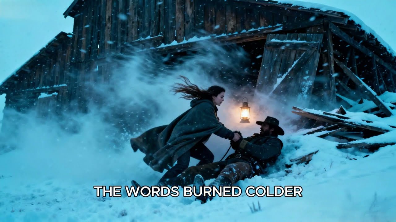 The snow came in sheets, blinding, relentless. She called his name, but the wind stole the sound. When she reached the barn, the door hung open, half buried. Inside, the lantern lay shattered, the horses stamping in panic. Beneath a fallen beam, Silas lay still, her heart stopped. She stumbled toward him, her hands clawing at the splintered wood.