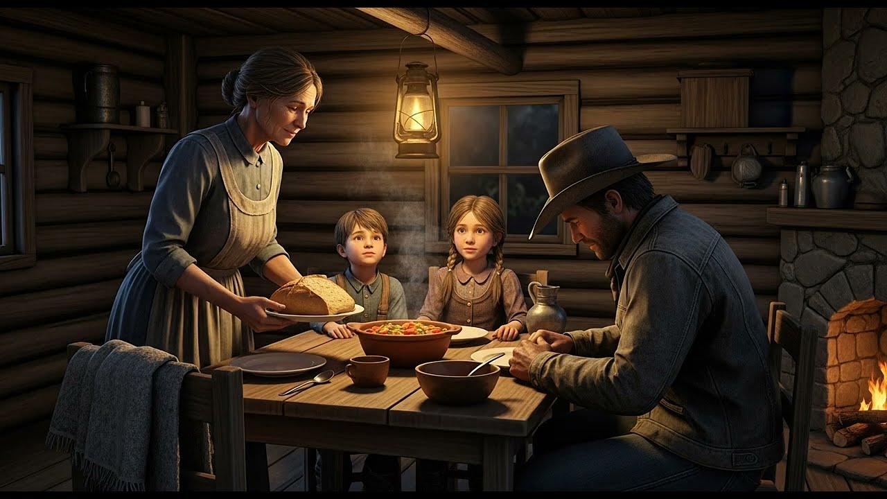 Clara needed what little dough she had left and baked a small loaf of bread. The smell of fresh bread filled the room, comforting and simple. She set the table with carefree chipped plates and a pot of stew, mostly made from vegetables and a little salt pork dot as they ate. The stranger remained quiet for a time, glancing occasionally at the children’s eager faces.