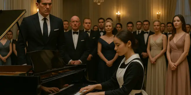 She nodded timidly and approached the grand black Steinway. With a microfiber cloth, she began to wipe it gently — but as her fingers brushed the keys, an irresistible impulse stopped her. It wasn’t just a luxury object. It was her secret dream.