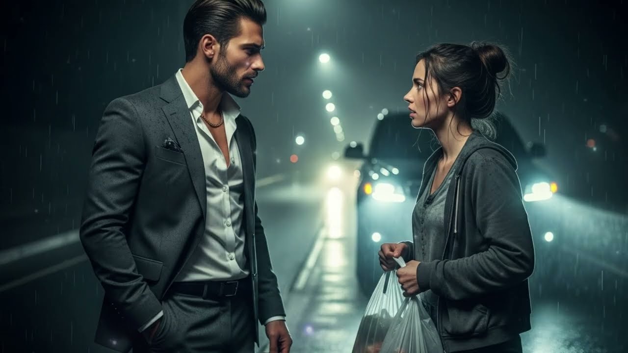 Headlights cut through the drizzle like twin blades. A vehicle approached with predatory silence. a black SUV that screamed money and danger in equal measure. It stopped at the curb, engine purring like a satisfied cat. The back door opened. A man stepped out.