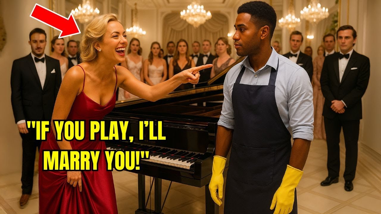 When an arrogant billionaire woman mocked a black janitor, “If you can play that piano, I’ll marry you.” She had no idea. That night would become the greatest shock of her life. That night, New York blazed with light. Outside the Witmore Grand Hotel, spotlights swept across the red carpet, cameras flashing like bursts of fire.