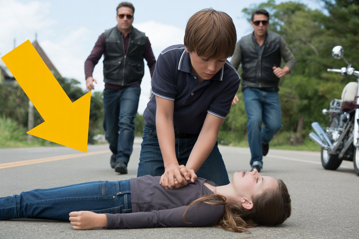 The bikers surged forward, but panic froze their hands. They were strong, fearless adults suddenly powerless in the face of a child’s stillness. Ava wasn’t breathing right. Her small chest fluttered, then stalled in a terrifying rhythm I recognized instantly. I ran for my phone, shouting for someone to call an ambulance. But before any adult could reach her, before Bayer could gather his daughter into his shaking arms, a small boy with a crooked arm and wide, terrified eyes ran faster than anyone.