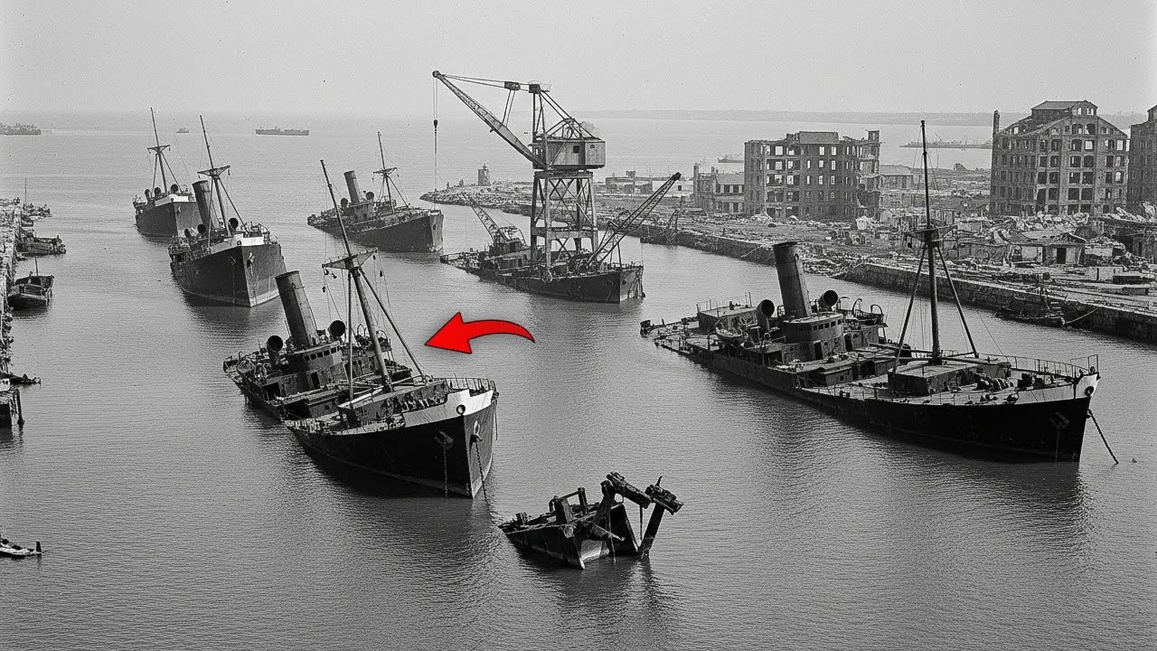 The morning sun reveals a landscape of calculated destruction that takes his breath away. This isn’t battle damage. This is systematic annihilation. Sibli’s boots crunch across twisted metal and broken concrete as he makes his way toward the harbor basin. What he sees defies immediate comprehension. 27 ships, freighters, tugs, even a floating dry dock lie scuttled in precise positions across every navigable channel. The Germans hadn’t simply sunk vessels randomly.