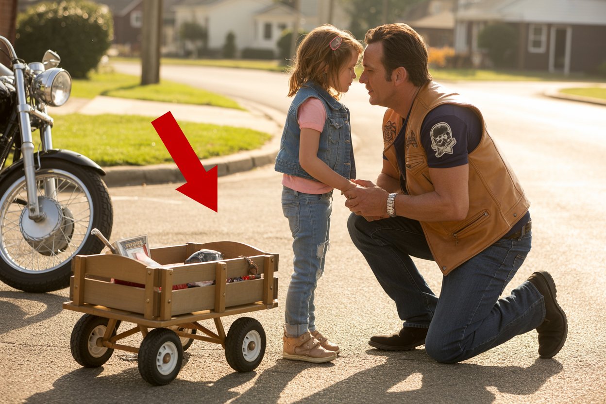 Chrome shining like metal fire. The man riding it looked like someone pulled straight out of a movie. The kind of man other people crossed the street to avoid. Leather vest, heavy boots, tattoos peeking from under his sleeves. Lily didn’t know much about the world, but she knew this. Bikers were scary. Her wagon rattled as she pulled it closer.