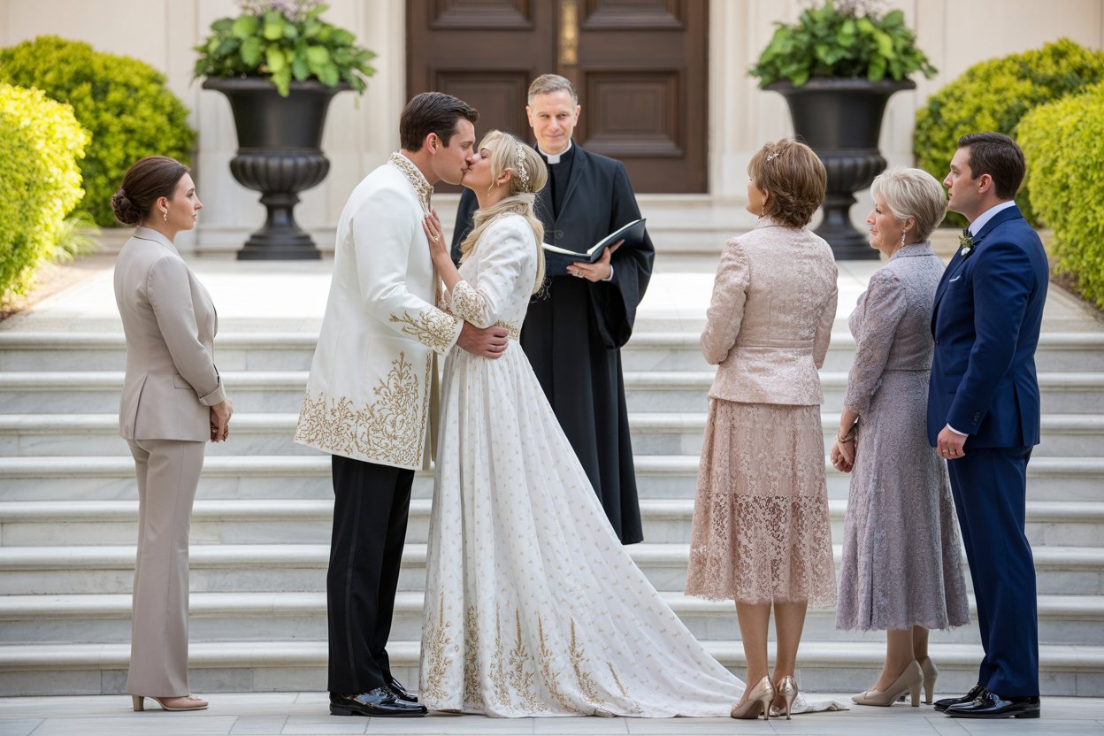 The cars behind it formed a perfect line. Chauffeers in uniform jumped out and opened doors, but everyone was watching the limousine. The driver rushed to open the back door, and my heart stopped. Adrienne stepped out, and I didn’t recognize him at first. He was wearing a complete groom’s outfit, an absolutely stunning white designer suit with gold embroidery that caught the sunlight.