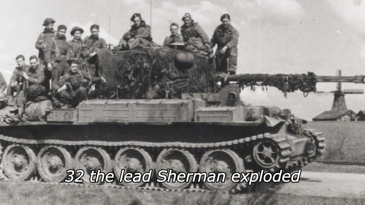 His total loadout weighed approximately 16 kg. At 0832, the lead Sherman exploded. The noise was a flat crack followed by the metallic shriek of armor tearing. A panzer Shrek round had struck the front glacis plate. The tank stopped. Smoke poured from the engine compartment. Carter and the other men riding on the decks jumped off and took cover behind the disabled vehicle.