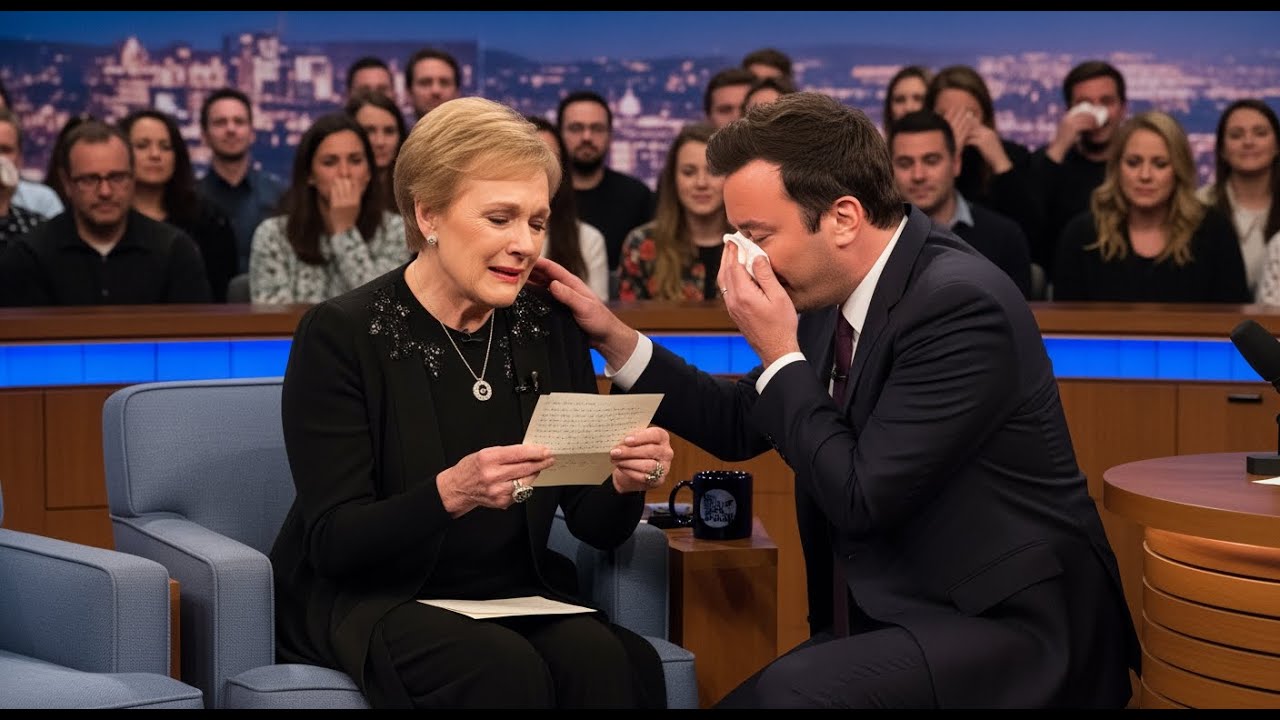 The microphone trembled in Jimmy Fallon’s hand. Studio 6B fell silent. What started as another Tuesday night taping became the moment that shattered television forever. Dne Julie Andrews, the 89year-old legend who had enchanted generations with her voice, sat across from Jimmy with tears streaming down her weathered cheeks.