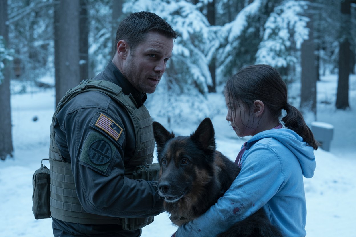 Shadow lay low to the ground, breathing hard but alert like he’d been running for his life. The dog pressed his nose against Ethan’s jacket, then turned sharply toward the woods and barked once. A signal, a direction, a command. Ethan didn’t wait another second. Shadow bolted into the dark, the girl holding Ethan’s sleeve as they sprinted behind the dog. Branches slapped their faces.