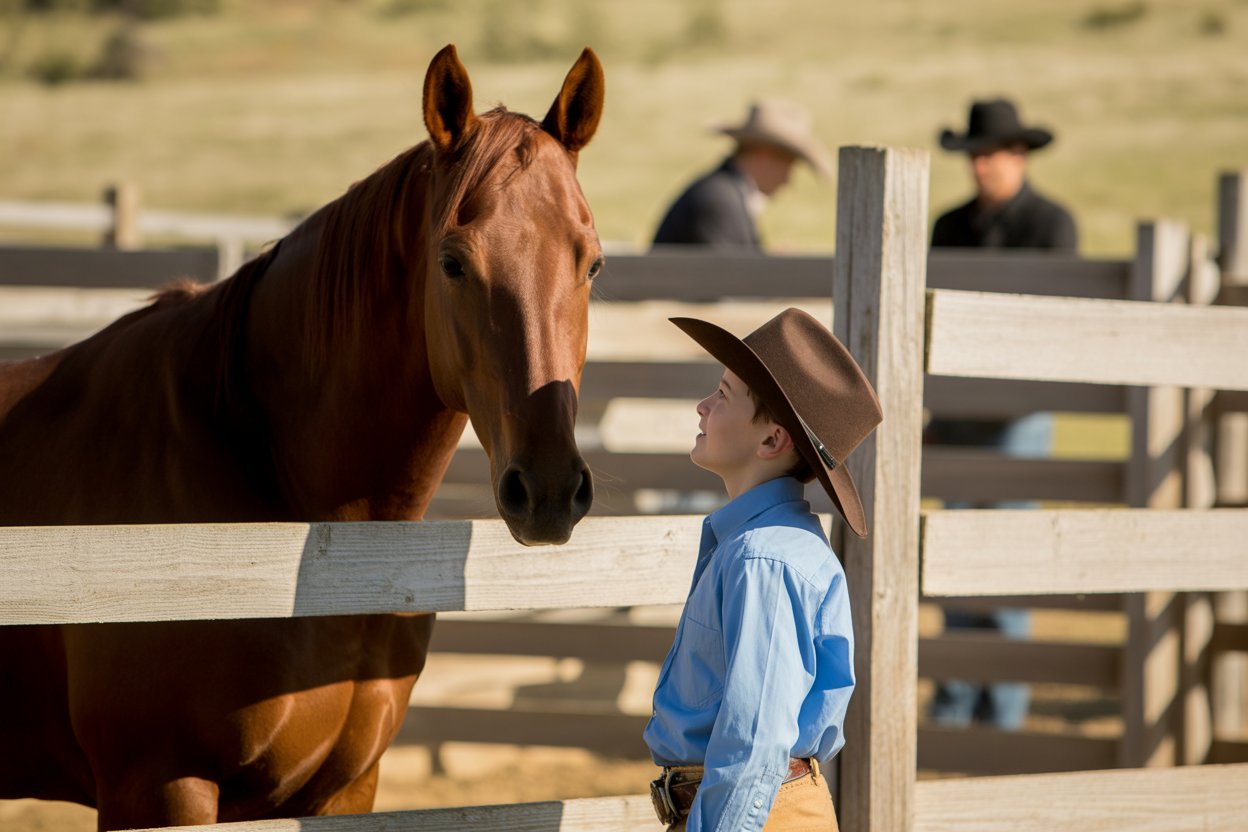 Ranchers from all over the region, merchants, local politicians, and onlookers gathered to witness what was being called the bet of the century. Ethan arrived at the corral with thunder. The horse showed signs of nervousness from all the noise and movement, but trusted the boy to guide him. The colonel was visibly tense.