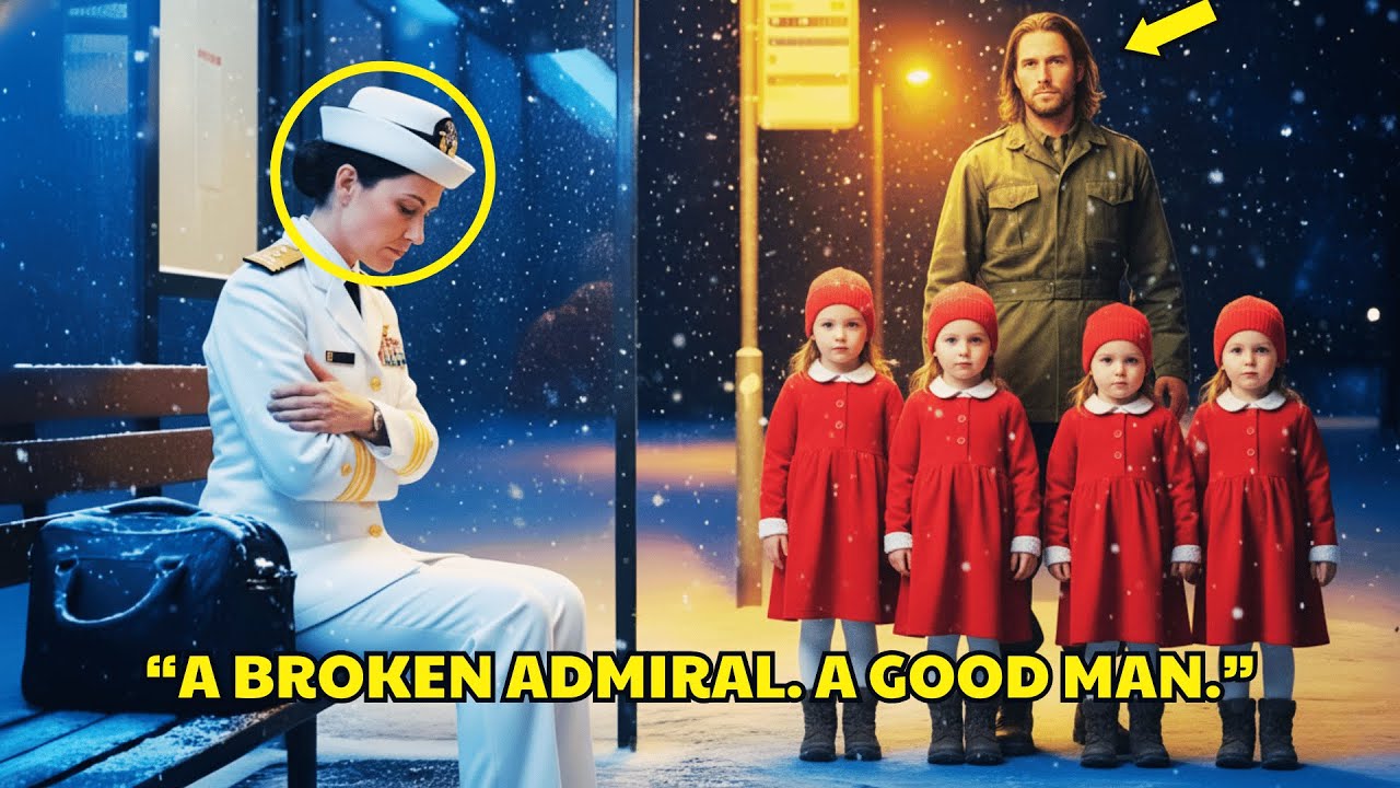 On the coldest night of her life, a Navy admiral, broken by rejection and stripped of the one thing she believed made her worthy, sat alone at a deserted bus stop, ready to disappear into the shadows. But fate had other plans. Because that same night, a quiet janitor with four little girls in red dresses stopped, looked at her, and chose to bring her home.