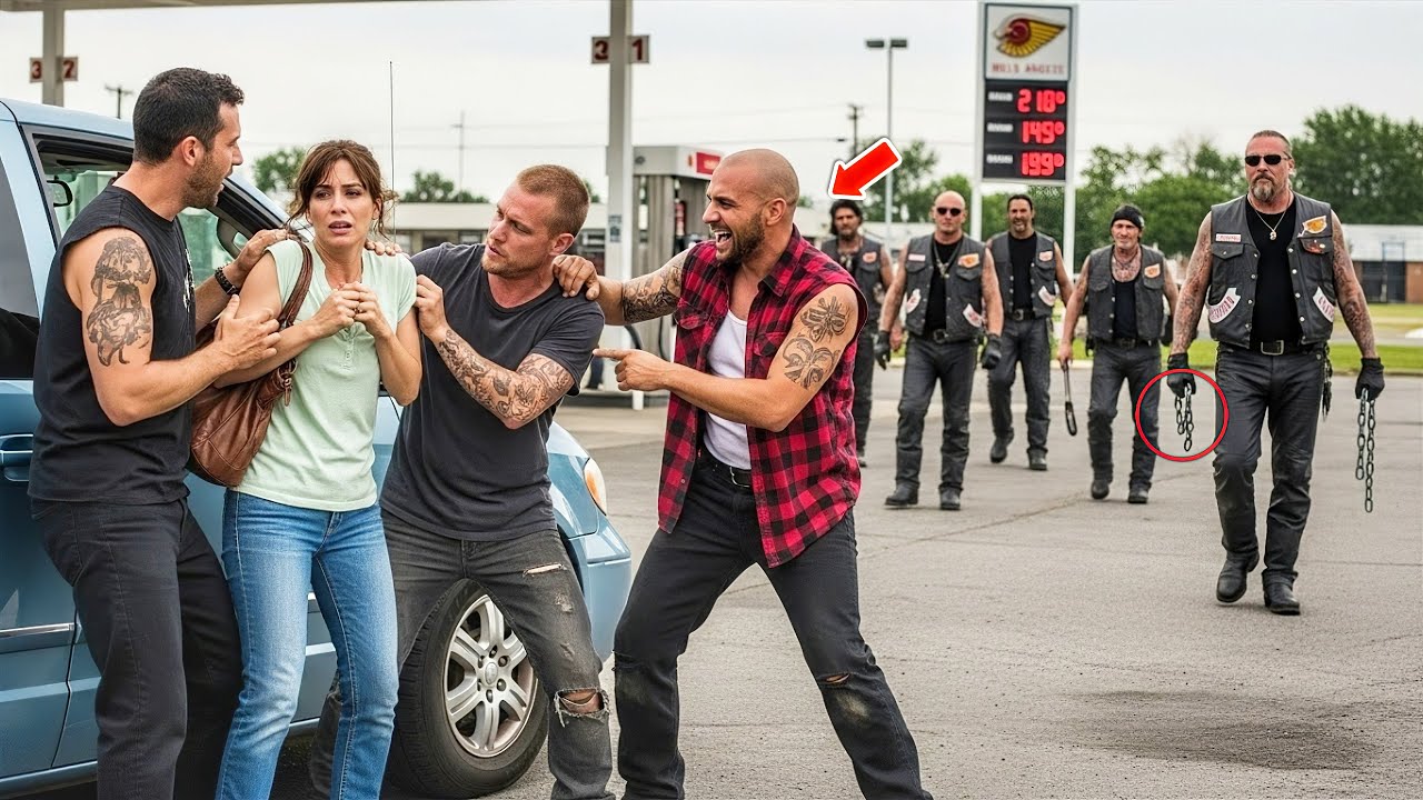 At first, the men didn’t notice, but Marissa did. She turned her head toward the road, and her eyes widened. Rolling in like a storm were nearly a dozen motorcycles, their chrome glinting beneath the harsh sun, their engines roaring like wild animals. The gas station seemed to tremble as they pulled in, one after another, forming a line that seemed both menacing and magnificent.