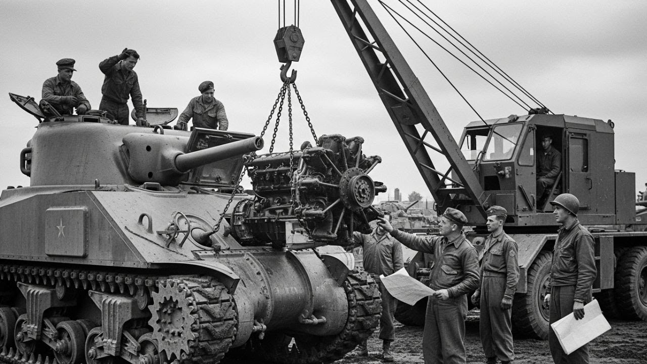 Frighters packed with Sherman tanks rolled into British ports. Their cargo holds filled with the hum of hundreds of preserved right radial engines. British dock workers stared in disbelief as the tanks were unloaded. Even before the war zone, their strange circular rear casing set them apart from anything Europe had seen.